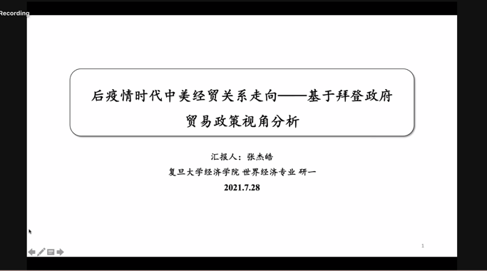 来自复旦大学的张杰皓同学以拜登政府贸易政策为切入口,对中美经贸关系走向进行了探讨与预测,并针对中美经贸如何实现良好发展提出了建议。