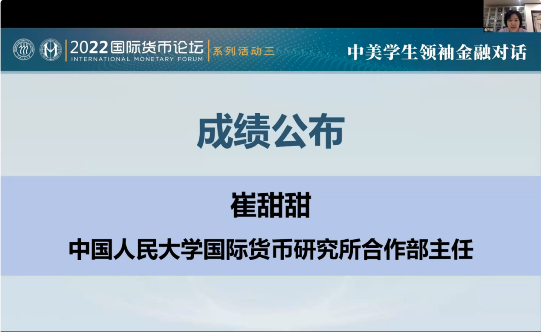 随后,专家评委给每位选手打分。夜色 国际货币研究所国内合作部主任崔甜甜代表会务组宣布了获得一、二、三等奖的中美双方选手的名单。美方学生中,欧勤爱获得一等奖,葛瑞斯、金博尧获得二等奖,陈美恩、康睿、贝慨希获得三等奖。中方同学中,张宏伟获得一等奖,潘颖颖(论文合作者:孙翼)、任堉秸获得二等奖,林柏帆(论文合作者:李诺函)、李明(论文合作者:王寒冰)、林靖澄(论文合作者:何泰屹)获得三等奖。