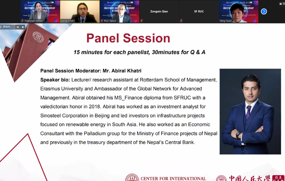 Jan 10th, the School of Finance, Renmin University of China (SFRUC) and RUC North America Alumni Association (NAAA) successfully co-hosted the “Investment and Entrepreneurship in Today’s World” Alumni Webinar. This event invited prominent RUC alumni worldwide with finance and entrepreneurship background sharing their insights and stories, including Mr. Abiral Khatri (MSF Alumni 2018) as the panel moderator, and Ms. Ning Guan (Alumni of Industrial Economics, 1991), Mr. David Qi Tang (Alumni of International Economics, 1997) , Dr. Xiaobo He ( SFRUC alumni, 2020), and Mr. Jorge Qiao (MSF Alumni 2019) as the panelists. The Webinar was hosted by Ms. Yuanyuan Song, Director of the Center for International Programs, SFRUC.