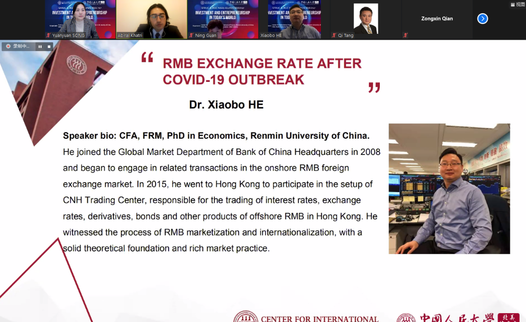 Dr. Xiaobo He, Senior Dealer at Bank of China, CNH Trading Center reviewed foreign exchange rate reform of China and explained reasons for the appreciation of RMB in recent months. He pointed out the effect of controlling the Covid-19 epidemic, the trend of the dollar index and Interest rate spread between RMB and USD are the three main factors affecting the trend of RMB in 2020. He predicted the global economy will be repaired in the second half of the year as the vaccine put into use and the US-China interest rate gap will narrow but still higher than the long-term average.