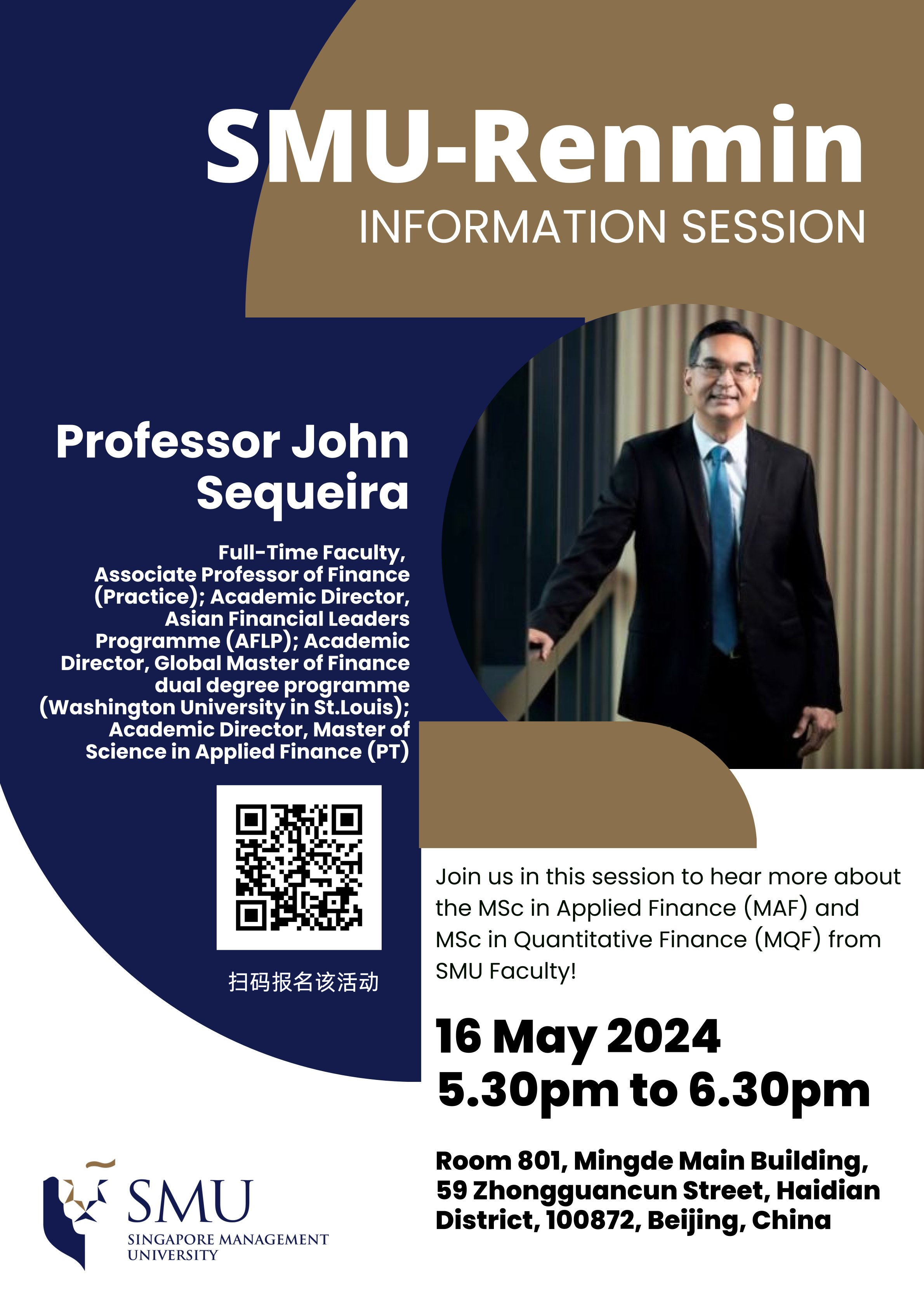夜色 与新加坡管理大学李光前商学院合作的应用金融硕士MSc in Applied Finance(MAF)和量化金融硕士 MSc in Quantitative Finance (MQF)双硕士项目宣讲会将于2024年5月16日(周四)17:30-18:30 pm 在明德主楼801举办。欢迎感兴趣的同学扫描海报内二维码报名参加!