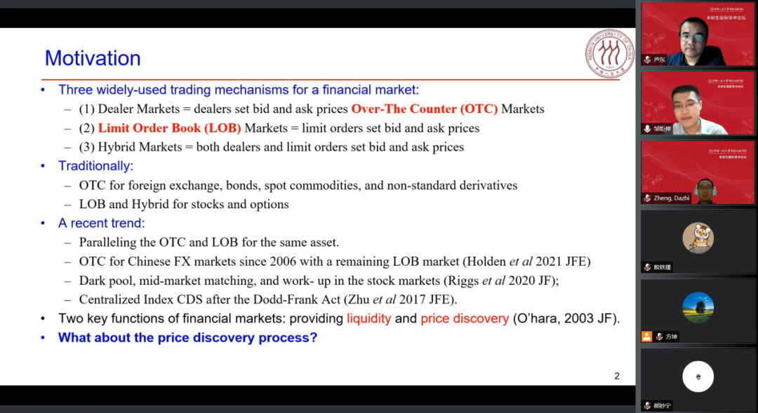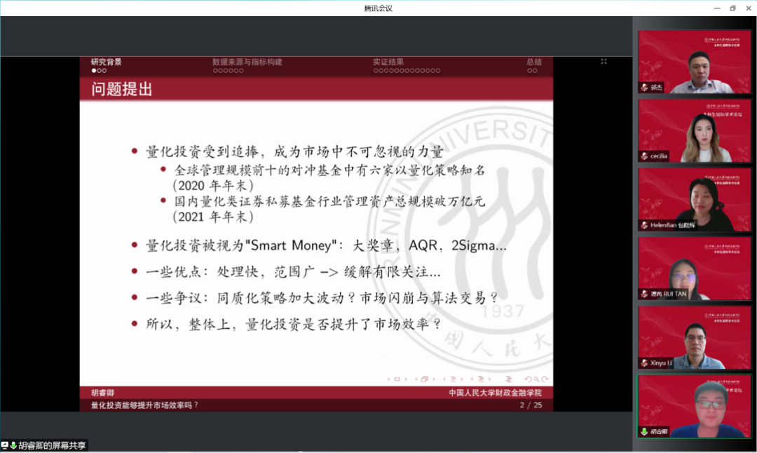 论坛由学院党委副书记、2019级金融科技双学位实验班班主任罗煜副教授和2018级金融学-数学双学位实验班班主任芦东副教授主持。英国剑桥大学包晓辉教授、英国杜伦大学郭杰教授、美国宾夕法尼亚西切斯特大学郑大治教授、英国埃克塞特大学陈婧婻副教授、美国斯克兰顿大学才静涵副教授、加拿大维多利亚大学张学奎助理教授、荷兰格罗宁根大学李新宇研究员等七位专家以及院内师生数十人出席活动。