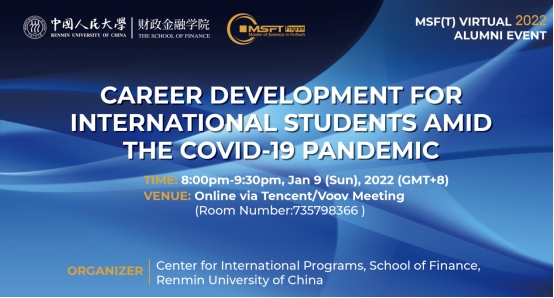 On the evening of Jan 10, the 2022 MSF(T) Virtual Alumni Event was successfully held via Tencent meeting. Organized by the Center for International Programs of the School of Finance, Renmin University of China(SFRUC), this year’s theme focuses on “Career Development for International Students amid the COVID-19 Pandemic”. Leo Wang, founder and CEO of HelloCareer was invited to give career development advice for international students along with four MSF alumni representatives to share their personal career experiences. Prof. Zongxin Qian, associate dean of SFRUC attended the event and delivered a welcome speech. Ms. Yuanyuan Song, director of the Center for International Programs, SFRUC hosted the event.