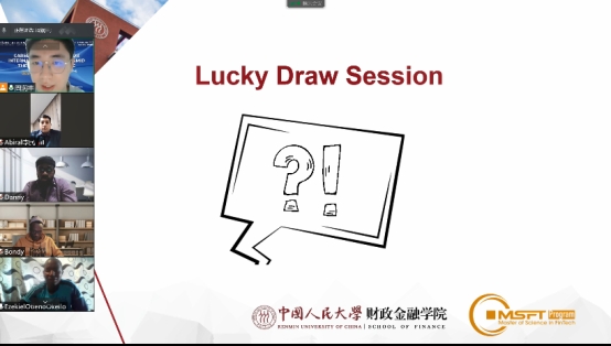 Runfeng Zhou, coordinator of the MSFT program hosted the Lucky Draw Session in the end. He said a “package” of transcripts of all the previous Online FinTech Webinars will be sent to all the participants for extended learning as a thank-you gift. In the meantime, a token of the MSFT program will be mailed to each speaking alumnus and alumna. In the end, everyone wished each other best wishes for the new year of 2022.