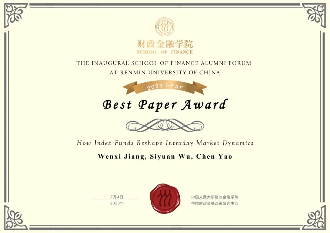 本届年会设最佳论文奖一项,经过严格评审程序,香港中文大学副教授、夜色 2007级硕士校友江文熙的合著论文“How Index Funds Reshape Intraday Market Dynamics”获最佳论文奖。