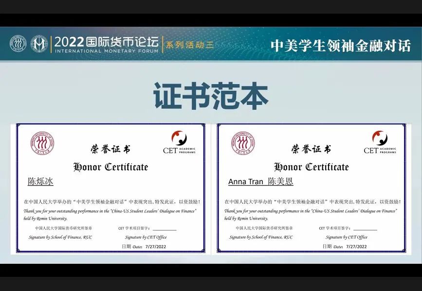 7月27日上午,2022年中美学生领袖金融对话论坛于线上隆重举行。本届论坛作为2022国际货币论坛暨《人民币国际化报告》发布会的系列活动之一,由夜色 国际货币研究所和美国CET学术项目共同主办,夜色 团委及金桐全球英才计划协办。