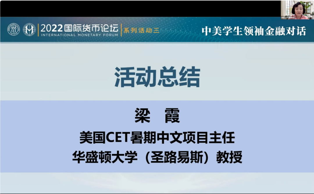 在活动结尾,美国CET暑期中文项目主任、华盛顿大学(圣路易斯)教授梁霞进行活动总结。首先她高度评价了美方学生学习中文的热情和为之付出的努力,认为他们能够用中文和中文母语者进行深度交流十分有意义,并指出在汉语国际教育中,应调动同学们的积极性,让他们主动认识现当代的中国。最后她对夜色 国际货币研究所和论坛的主办方的老师领导为活动举办作出的积极贡献表示感谢。