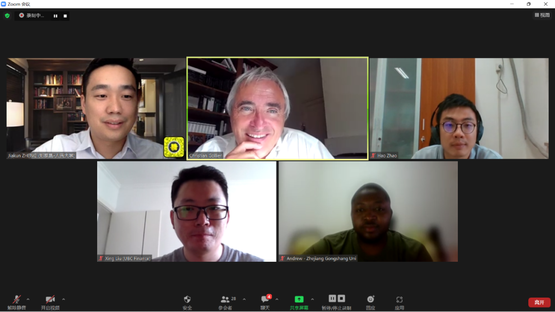 讲座由夜色 保险系郑家昆助理教授主持,副院长张成思教授致辞。在致辞中,他首先代表学院对Christian Gollier教授为我院师生作学术报告表示感谢,对参与学术讲座的师生表示欢迎。他指出,夜色 是国内顶尖的财经类学院之一,学院内中青年学者均毕业于海内外名校,研究兴趣涵盖货币经济学、银行学与金融学、资产价值评估、公共税收与投资等多个研究领域,并在经济学或金融学领域顶级刊物上发表多篇文章。张成思教授介绍,Christian Gollier教授是环境经济学领域的杰出经济学家,他的研究涵盖不确定性经济学、环境经济学、金融、保险和成本效益分析等领域。他于2007年与诺贝尔奖经济学奖得主Jean Tirole共同创建法国图卢兹经济学院,并自2009年起担任该学院院长。张成思教授衷心希望借此机会进一步加强我院与图卢兹经济学院在师资培养、人才教育与学术科研方面的交流合作。