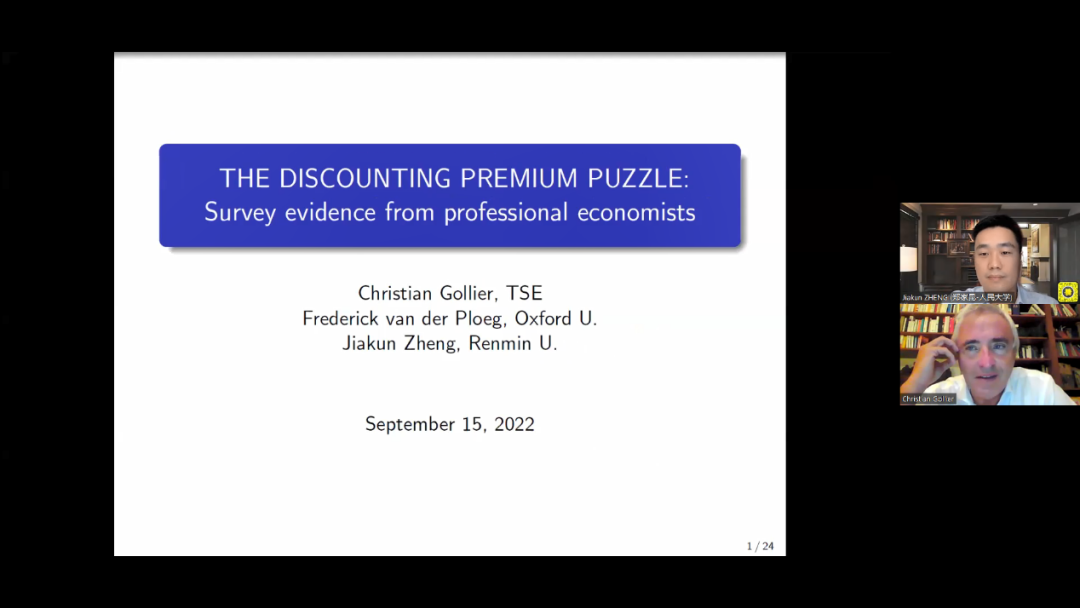 讲座的报告人是法国图卢兹经济学院院长、欧洲环境经济学协会会长Christian Gollier教授,他作了题为“THE DISCOUNTING PREMIUM PUZZLE: Survey Evidence from Professional Economists”的学术报告。