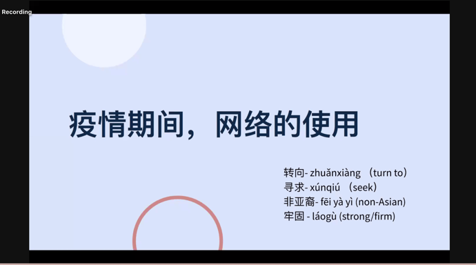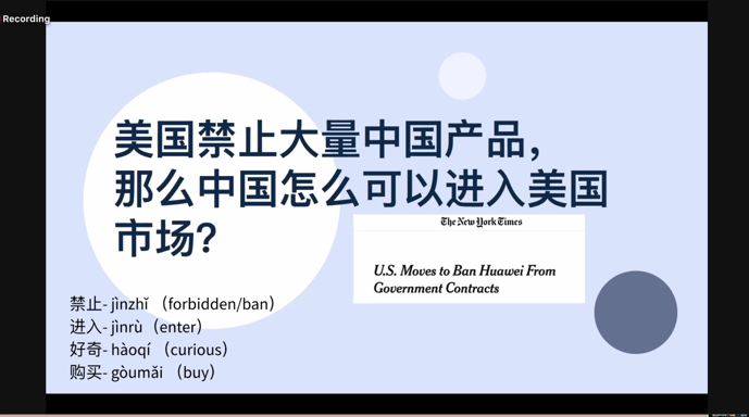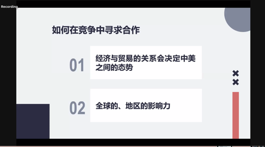 来自乔治城大学的Leo John Arnett同学指出后疫情时代中美经济复苏对全球经济的影响,并就中美经贸关系走向等问题进行了展示与交流。