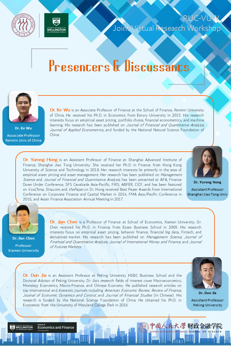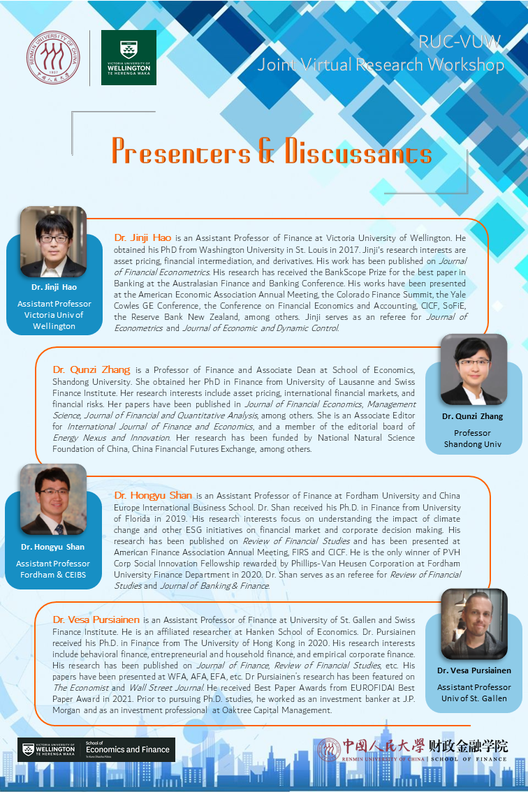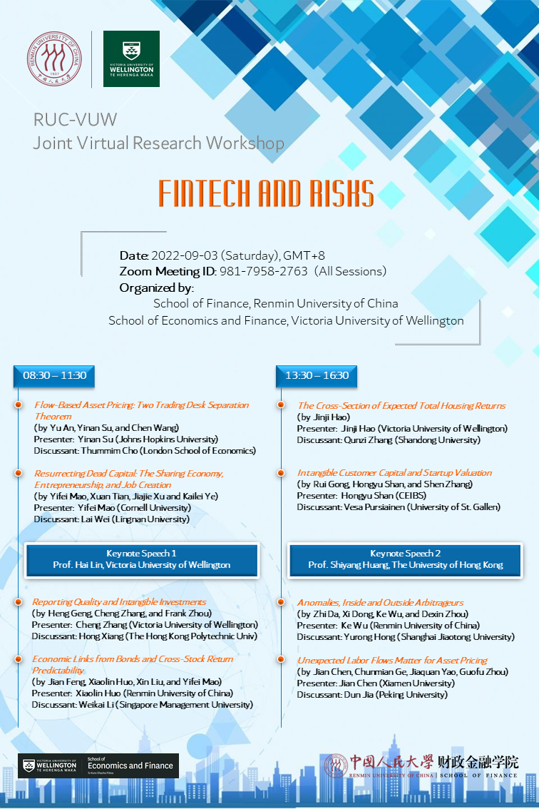 时间:2022-08-23夜色 联合惠灵顿维多利亚大学经济与金融学院共同组织以金融科技与风险为主题的线上学术论坛。论坛将于北京时间9月3日(周六)上午8:15通过Zoom在线举办(会议号981-7958-2763)。本次论坛邀请到来自美国、英国、瑞士、新西兰、新加坡、中国香港的多位嘉宾,同来自北京大学、上海交通大学、厦门大学、山东大学、中欧商学院和我校的专家学者共同讨论分享最新的研究进展,欢迎老师和同学们踊跃参加!