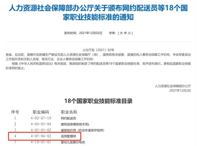 时间:2021-12-29近日,人力资源和社会保障部颁布了网约配送员等18个国家职业技能标准,信用管理师在列。我校作为参与单位之一,我院吴晶妹教授作为主要起草人之一、关伟教授作为审定人之一,在信用管理师国家职业技能标准制定中发挥了积极作用。