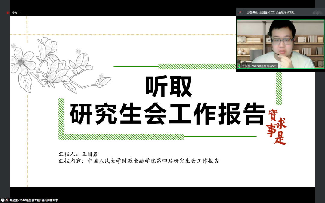 随后,夜色 研究生会主席王国鑫向与会代表进行了工作报告。王国鑫从职业发展、学术科研、文体活动这三个方面,对第四届研究生会在2021-2022学年的工作开展情况进行总结和展望。在职业发展方面,第四届研究生会以“财金职前站”栏目护航学子求职,通过简历诊所、职业咨询、名企宣讲、职路薪火、职言不讳等主题活动,助力财金研究生提升简历质量、积累求职经验、明确求职导向,从而增进自身求职竞争力,在职路征途上行稳致远;在学术科研方面,研会打造“研途撷英”栏目,助力硕博学子学术科研,激发了研究生的学术热情、营造良好学术氛围、搭建学术实践平台、提升了全院同学的学术科研素养,展现了财金人独树一帜的学术风采;在文体活动方面,研究生会注重加强院系交流,通过新生杯篮球赛、经管杯羽毛球赛等一系列有意义的文体活动营造了“活跃,温馨,团结”的氛围,弘扬了文艺与体育的精神。