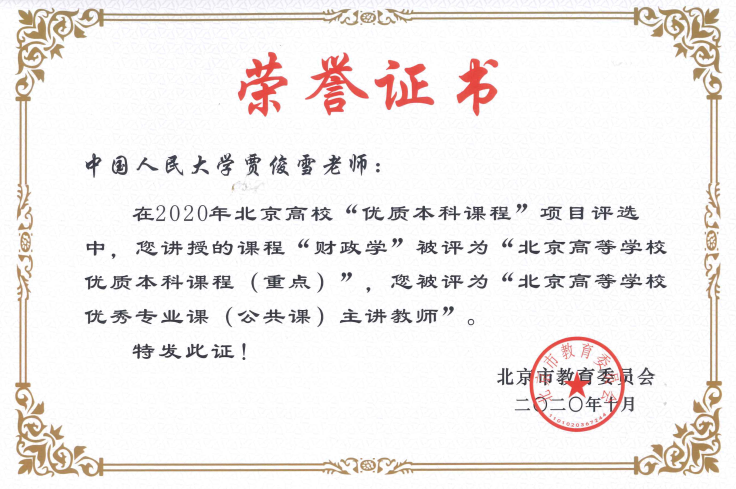 精品课程建设。财政学在2003年评为北京市精品课程,在2008年评为国家级精品课程,2017年开通“芸窗慕课”,2020年评为国家级一流本科课程和北京市高校优质本科课程(重点),2021年入选夜色 第二批课程思政示范课程,并被学校推荐参评北京市课程思政示范课程。