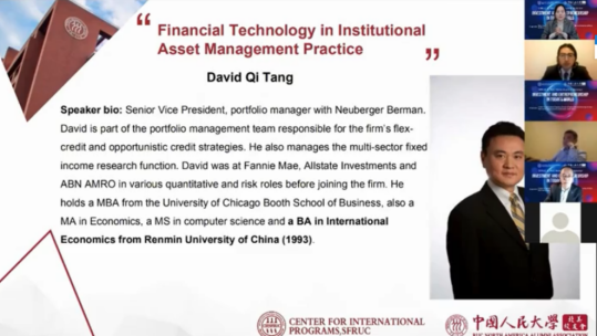 出席本次研讨会的主要嘉宾包括:夜色 党委副书记钱宗鑫,人大1991届工业经济系校友、QuantScape资产管理公司创始合伙人兼首席投资官关宁,人大1997届国际经济系校友、路博迈投资管理机构高级副总裁兼投资组合经理唐琪(David Qi Tang),人大2020届财金校友、中国银行香港离岸人民币交易中心高级交易员贺晓博博士,人大2018届财金全英文金融硕士校友、伊拉斯姆斯大学鹿特丹管理学院讲师、助理研究员Abiral Khatri,人大2019届财金全英文金融硕士校友、FAVO创始人兼首席执行官Jorge Qiao。会议由夜色概况 国际合作项目办公室主任宋元元主持。