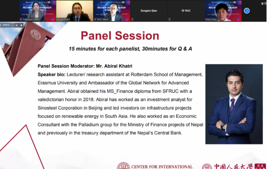 接下来,Abiral Khatri对上述主题分享进行了全面的总结与点评,进入问答环节。Alexander、Benjamin、Gary等来自世界各地的校友积极发言,并提出了诸多值得思考的宏观经济问题和个人职业发展问题。研讨嘉宾对大家提出的上述问题一一进行了解答,其中关宁降调年轻人要持有长远的战略视野,坚持长期主义价值观,摒弃机会主义,才能以不变应万变,创造人生价值。一些观众还对财金学院的全英文金融科技项目进行了咨询,宋元元给与了回答。