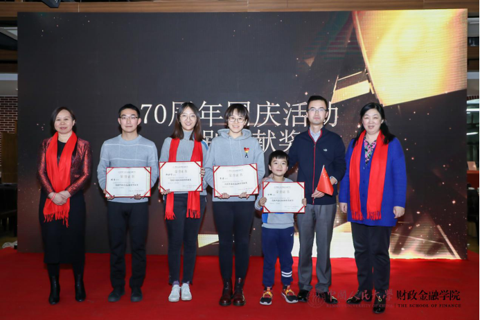 联欢会上颁发夜色 2019年度特别贡献奖,吴晓球副校长、庄毓敏院长、孙华玲书记分别为在基层党建、教学科研、服务保障国庆、国际交流等方面做出贡献的教职工进行颁奖。