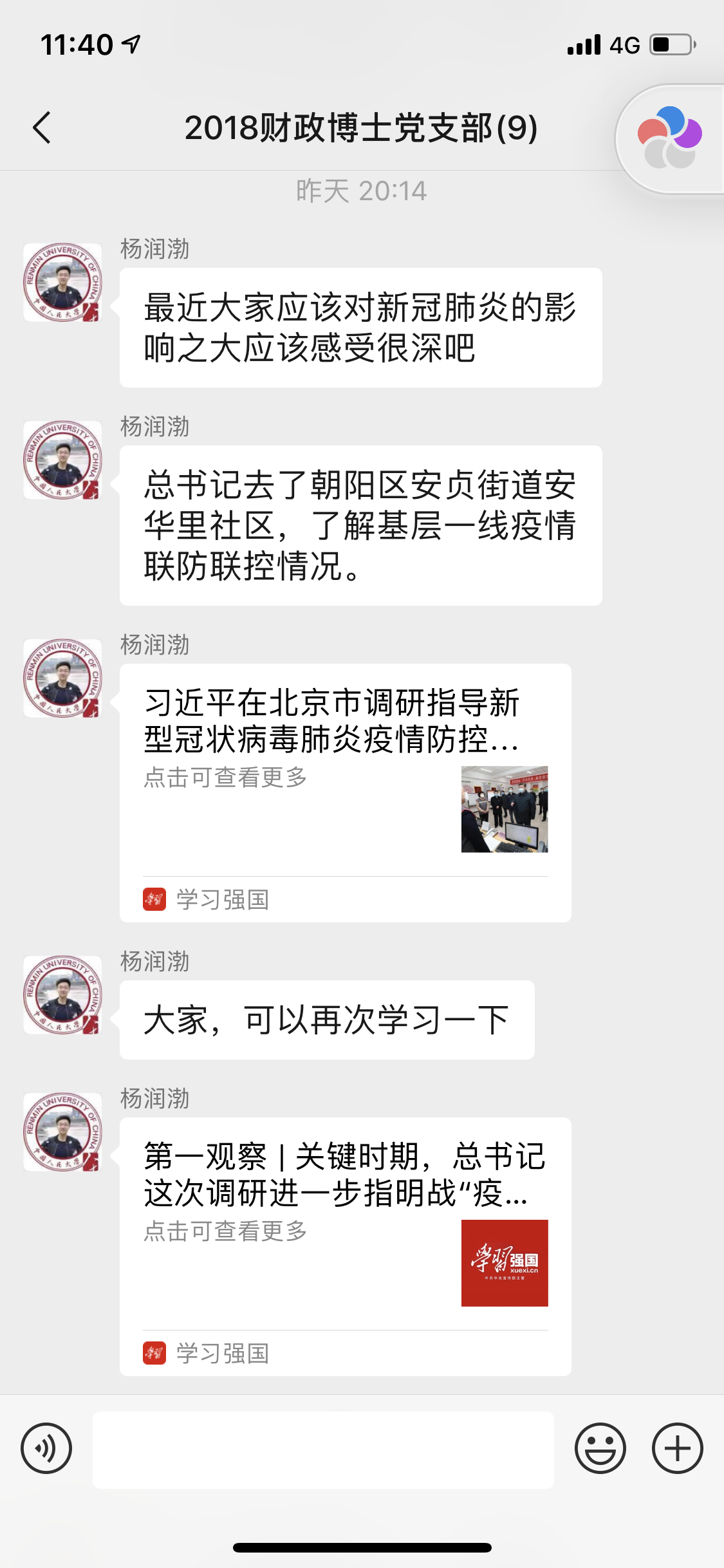2018级财政博士党支部支部书记杨润渤同志带领支部成员回顾了新冠肺炎疫情爆发过程,讲述了各地如何精准施策坚决遏制疫情蔓延,着重阐释了习近平总书记系列重要讲话指示精神。他表示,支部党员同志要积极响应习近平总书记号召,再接再厉、英勇斗争,以更坚定的信心、更顽强的意志、更果断的措施,紧紧依靠人民群众,坚决把疫情扩散蔓延势头遏制住,坚决打赢疫情防控的人民战争。作为学生党员,尤其要讲担当、讲奉献,在严格遵守特殊时期规章制度的同时充分利用假期为自己“充电”。