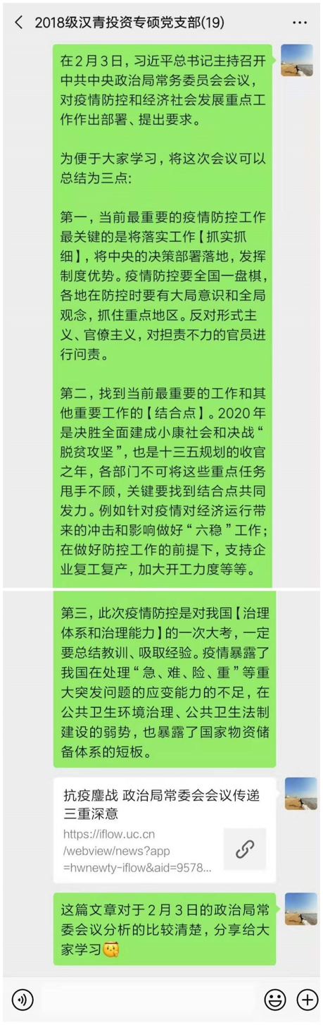 2018级汉青投资专硕党支部支部书记马申娟同志带领支部成员学习了2月3日习近平总书记主持召开的中央政治局常委会会议精神,传达了党中央对下一步疫情防控和经济社会发展重点工作的部署和要求。马申娟同志指出,作为共产党员,越是在危难关头越需要有担当精神,越需要起模范带头作用。正值春节假期,各位党员同志在家的首要任务是为身边的亲人朋友做好榜样,带头做到不传谣不信谣;同时,在保证自身安全的前提下尽可能地参加社区的防疫志愿服务工作,为抗疫贡献一份力量。