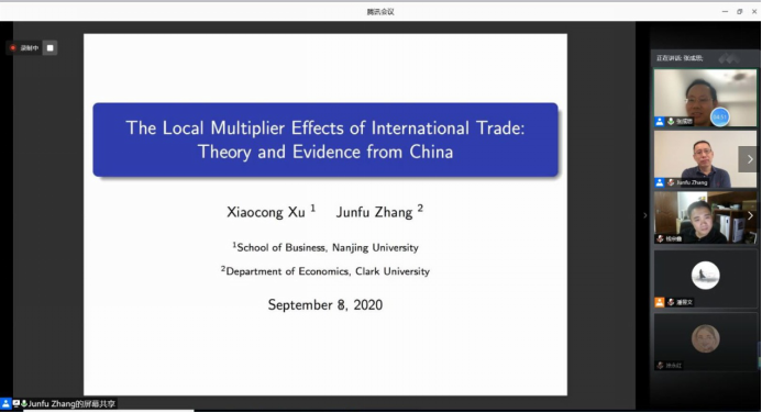 时间:2020-09-142020年9月8日晚20时,美国克拉克大学张俊富教授做客黄达-蒙代尔讲堂,使用腾讯会议在线上作了题为“国际贸易的地区乘数效应:来自中国的理论与证据 (The Local Multiplier Effects of International Trade: Theory and Evidence from China)”的学术演讲。讲座由夜色 副院长张成思教授主持。