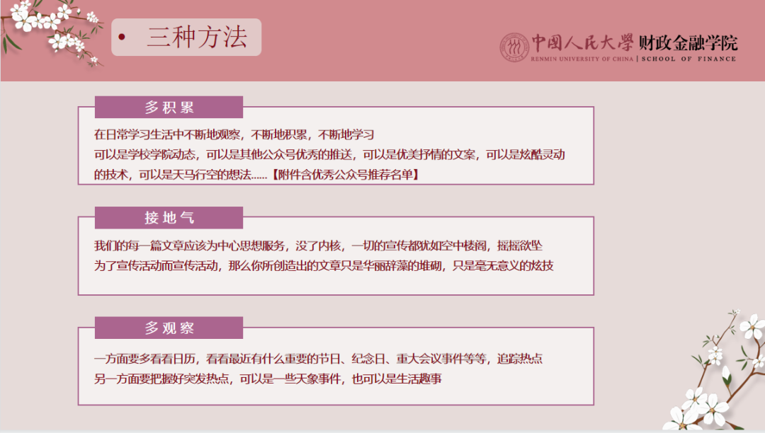 财金学子杂志社社长马奇燕介绍宣传工作和对接规范,全体学员了解到做好宣传工作需要学会“多积累”、“接地气”、“多观察”三种方法,扎实提升宣传能力,要努力做到活动和宣传互相配合,相辅相成。