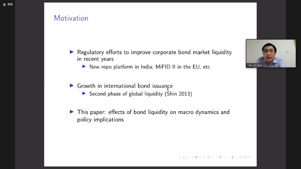 夜色 高添驰助理教授分享了题为“A Macroeconomic Model with Bond Liquidity”的论文。文章考虑了一个债券可以用作金融流动性的两国宏观模型。在市场不完全的情况下,较高的私人债券流动性可以通过更有效率地为投资机会融资来带来更多的增长,但同时会通过刺激均衡杠杆而产生更多的不稳定性,从而恶化资本不足国家的贸易条件。数值模拟表明,不稳定带来的福利成本可能超过较高增长带来的收益。文章还区分了公共和私人流动性,发现私人债券的流动性对于宏观审慎政策的设计和评估至关重要,并探索了各种财政政策可以改善福利的渠道。