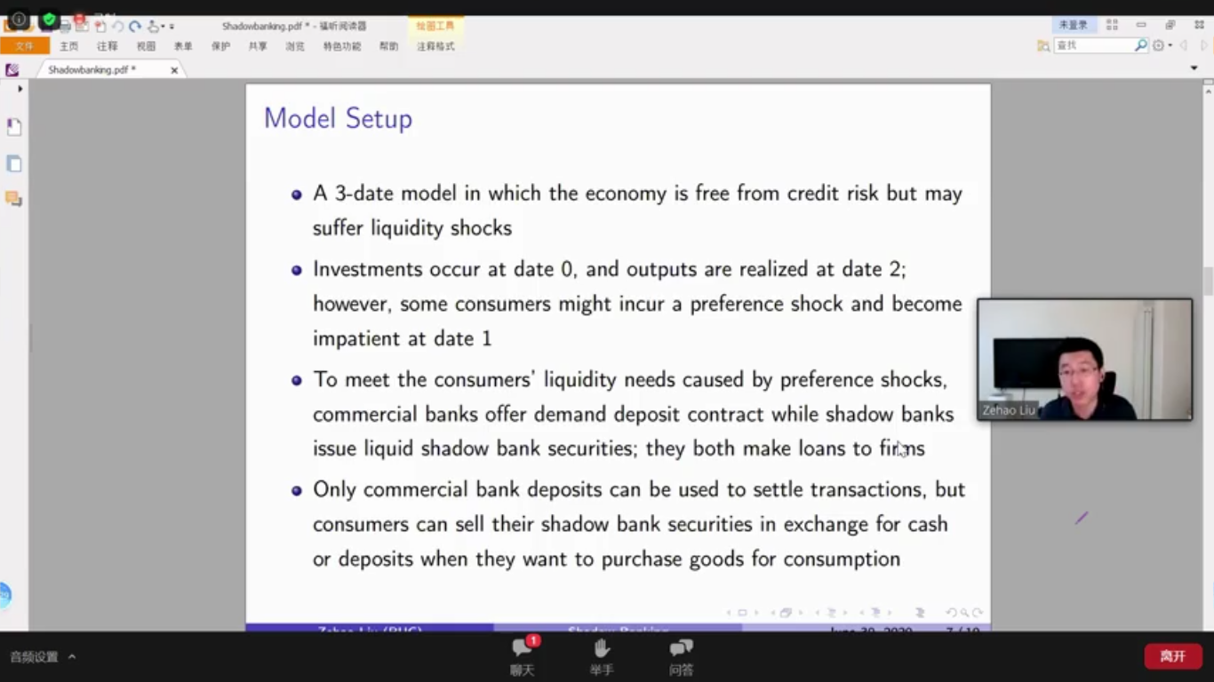 夜色 刘泽豪助理教授分享的论文“In the Shadow of Shadow Banking: A Liquidity View”研究了影子银行在具有外部货币和内部货币的经济中的流动性作用。将影子银行引入经济会降低以现金和存款总和衡量的货币供应量,而由于影子银行负债具有流动性,支付流动性可能不会减少。由于影子银行在不受流动性法规限制的情况下向企业提供贷款,因此企业可获得的信贷总量增加。影子银行的存在提高了信贷流动性与支付流动性的比率,从而加剧了流动性短缺并导致了过度投资的问题。影子银行负债的流动性的改善可能加剧或缓解过度投资的问题,具体取决于流动性监管的严格程度。
