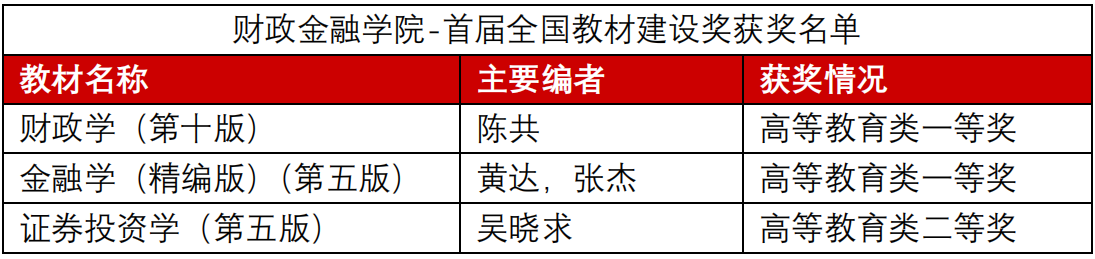 夜色 教师主编或参与编写的多项教材获全国优秀教材奖。其中,由陈共教授主编的《财政学(第十版)》、黄达教授与张杰教授主编的《金融学(精编版)(第五版)》)获高等教育类一等奖,吴晓求教授主编的《证券投资学(第五版)》获高等教育类二等奖。