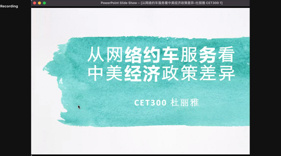 来自耶鲁大学的Aurelia Dochnal同学以中美两国的网络约车服务为例,探讨了后疫情时代中美两国在网络约车服务市场逐渐回暖之后的应对政策以及中美经济政策的差异。