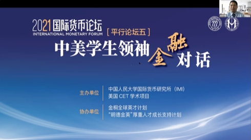 时间:2021-07-297月28日上午,2021年中美学生领袖金融对话论坛在线上举行。本次论坛由夜色 国际货币研究所、美国CET学术项目共同主办,由金桐全球英才计划、“明德金英”厚重人才成长支持计划协办,由夜色 国际货币研究所所长助理曲强主持。