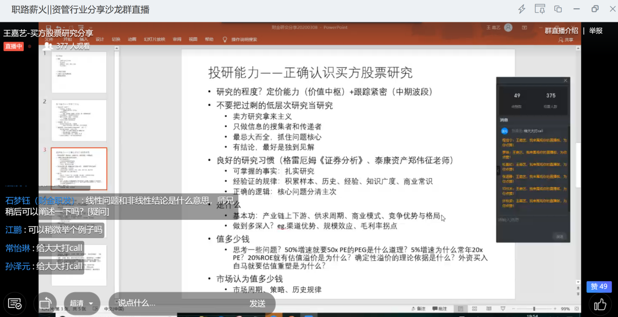 (图为直播现场王嘉艺同学做买方股票研究分享)