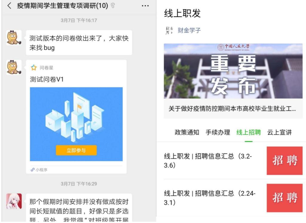 疫情防控期间,夜色 在服务保障就业、指导职业发展方面创新形式,心系学生需求,努力将疫情对学生职业发展的影响最小化。学院以问卷形式广泛征集学生居家防疫期间实习就业方面所需支持,并采取切实有效行动,开辟“财金学子——线上职发”专区,在线上及时发布就业政策通知、招聘信息、宣讲通知等。